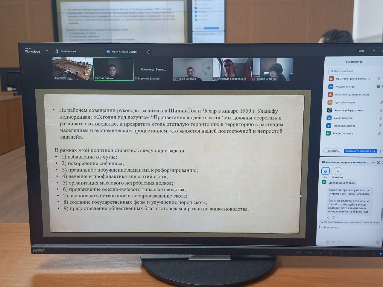 В своих докладах участники мероприятия сосредоточили внимание на том, как процессы модернизации повлияли на формирование государственной политики охраны общественного здоровья в странах Азии и Африки в XIX–XX вв. Докладчики рассмотрели вопросы, связанные с историей санитарных реформ в колониальной Индии, противодействием Азиатской холере и Маньчжурской чуме в Российской и Цинской империях, политикой Гоминдановского Китая в сфере общественного здоровья, реформой военно-медицинского службы КПК на территории Особого района в годы войны сопротивления японским захватчикам, политикой здравоохранения в Автономной районе Внутренняя Монголия КНР после 1945 г., возрождением традиционной медицины в Монгольской Народной Республике в послевоенный период, а также развитием традиционных форм врачевания в Северо-Восточной Африке.